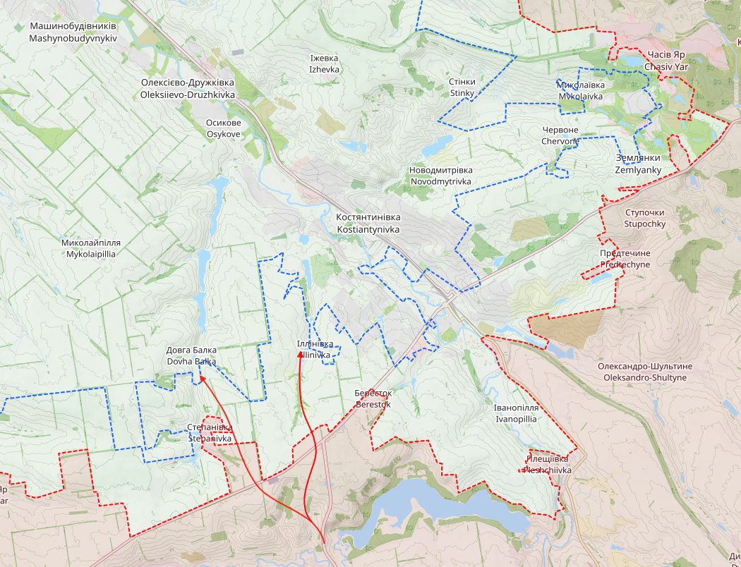 For comparison, here again is a map from the Black Bird Group. The Finns likewise see the main axes of attack running west of Kostyantynivka through Illinivka and Dovha Balka further to the west.