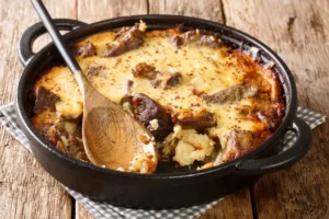 Typically prepared during holidays, Përshesh is made from crumbled cornbread mixed with turkey or lamb drippings and seasoned with herbs. It’s hearty, rustic, and deeply traditional.